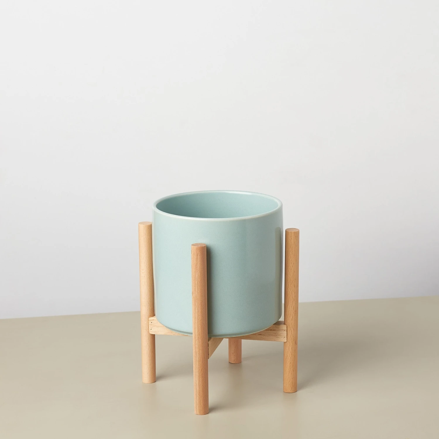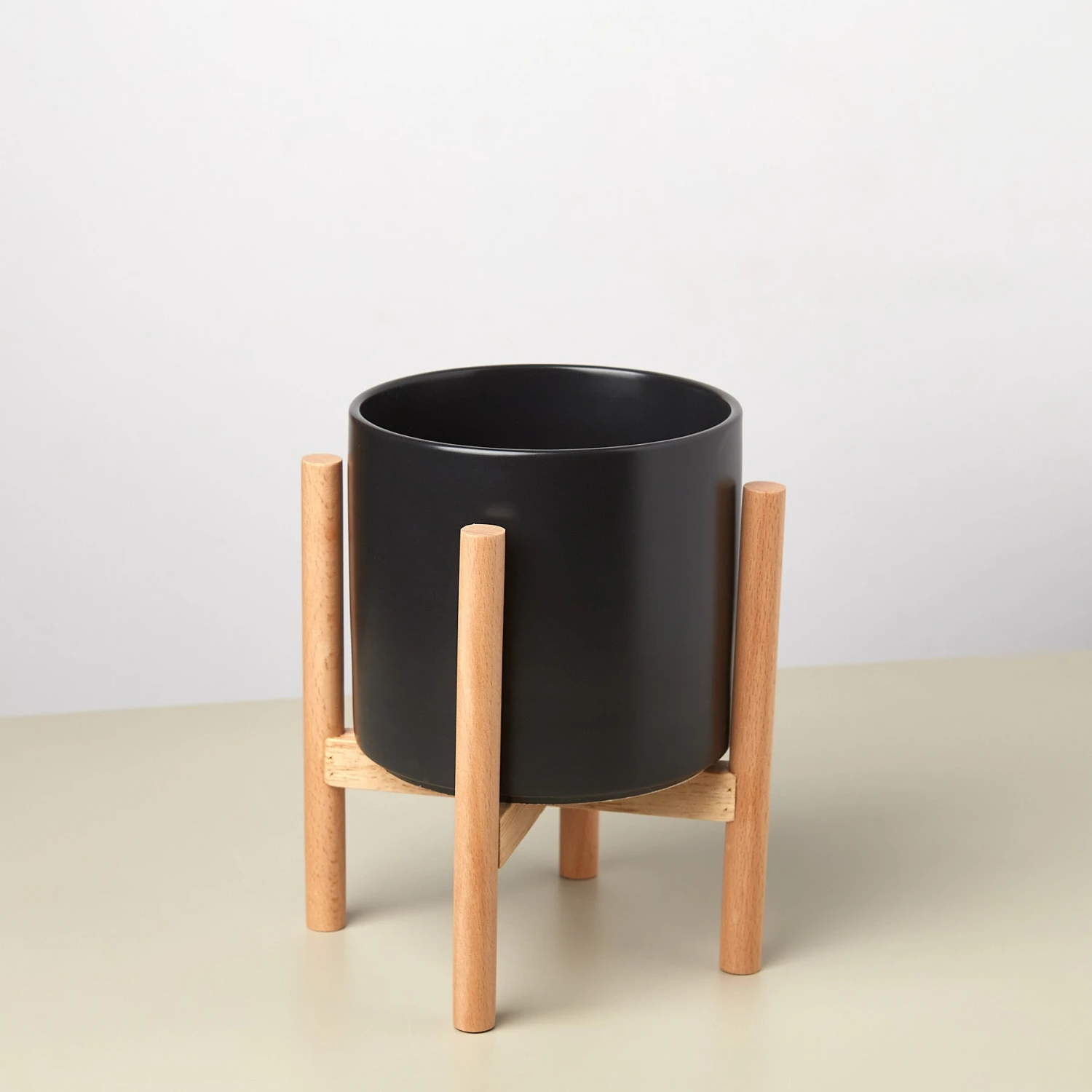 - Description: The ceramic cylinder planters come with a wooden stand to help elevate your plants off the ground.