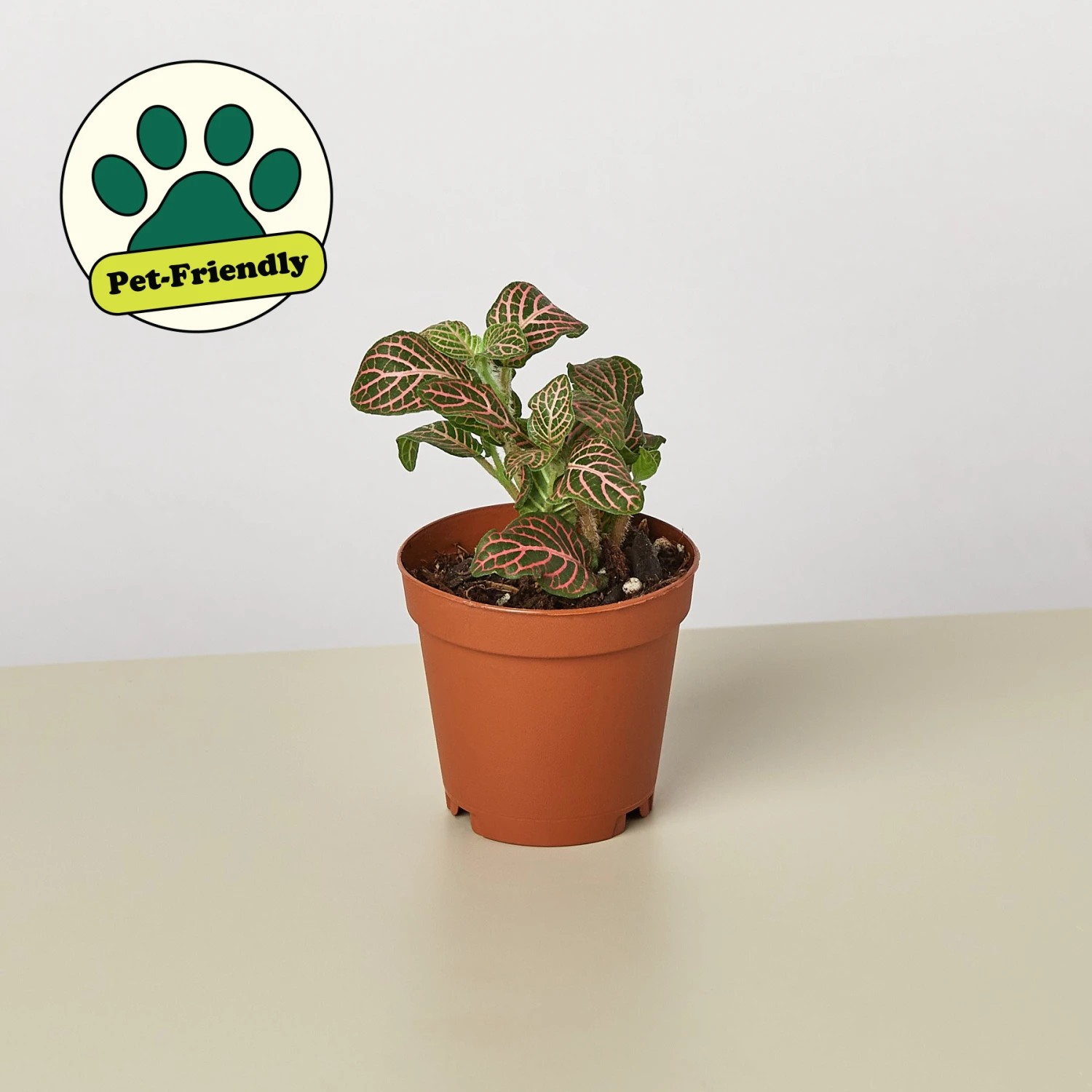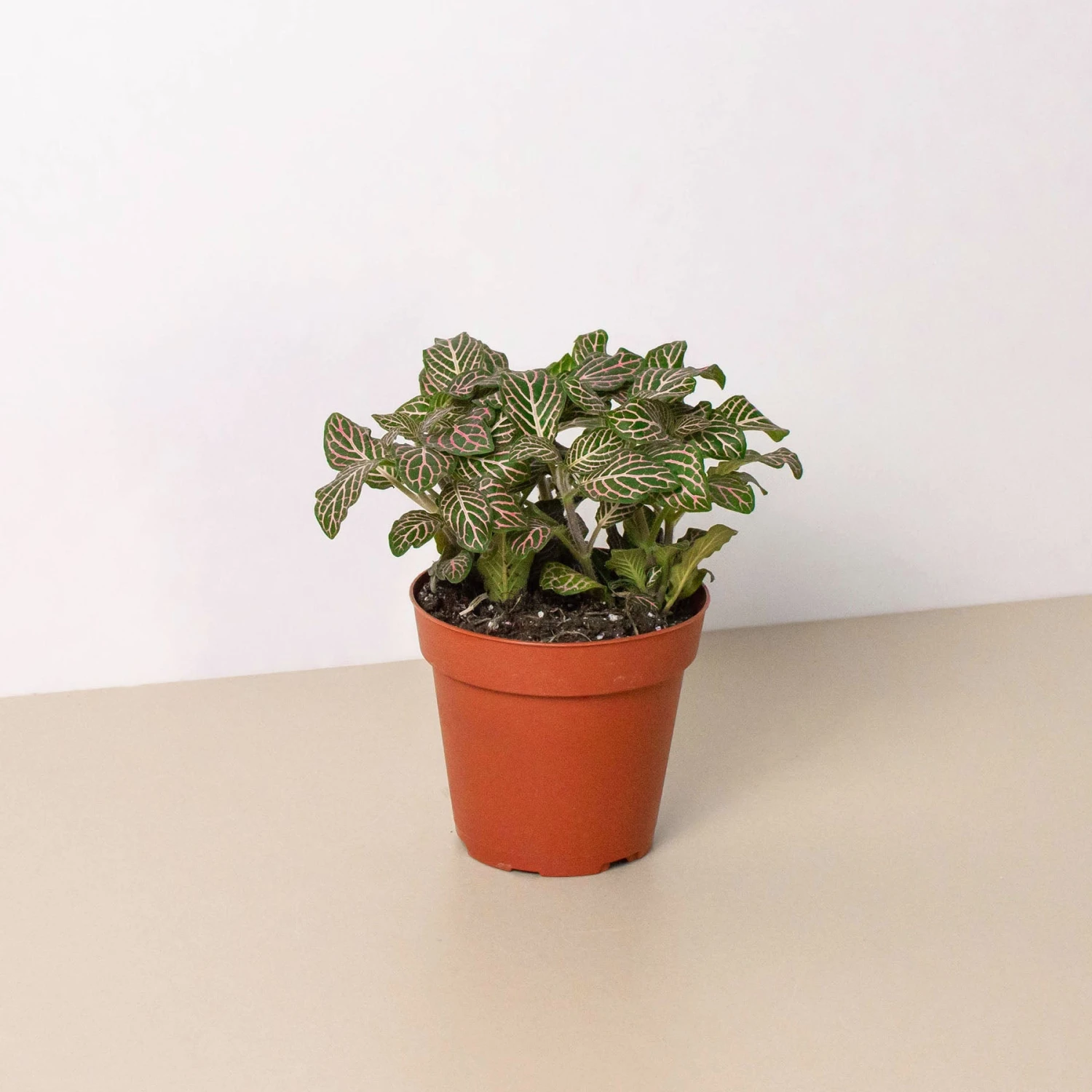 - Description: The Fittionia is a spreading evergreen perennial with delicately veined, deep-green leaves. Although the most popular vein color is silvery-white, you can also readily find varieties with veins in red, pink, white, and green. Small buds may appear after a time where the stem splits into leaves. Flowers are small with a white to off-white color.