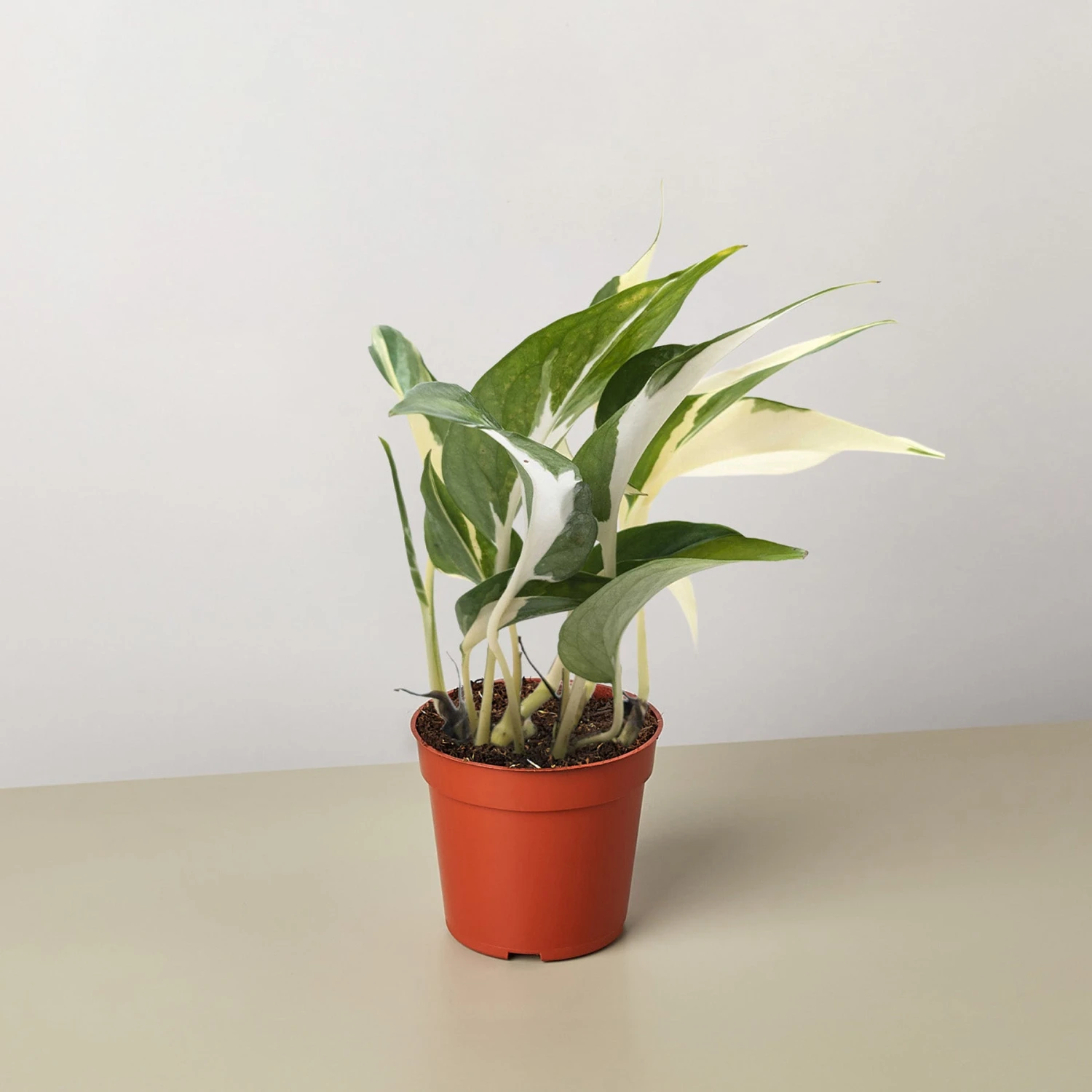 - Description: Â The Manjula Pothos is characterized by large, heart-shaped leaves with white, green, and cream variegation. These low-maintenance, vining houseplants thrive in bright, indirect light, moist but well-draining soil, and high humidity.