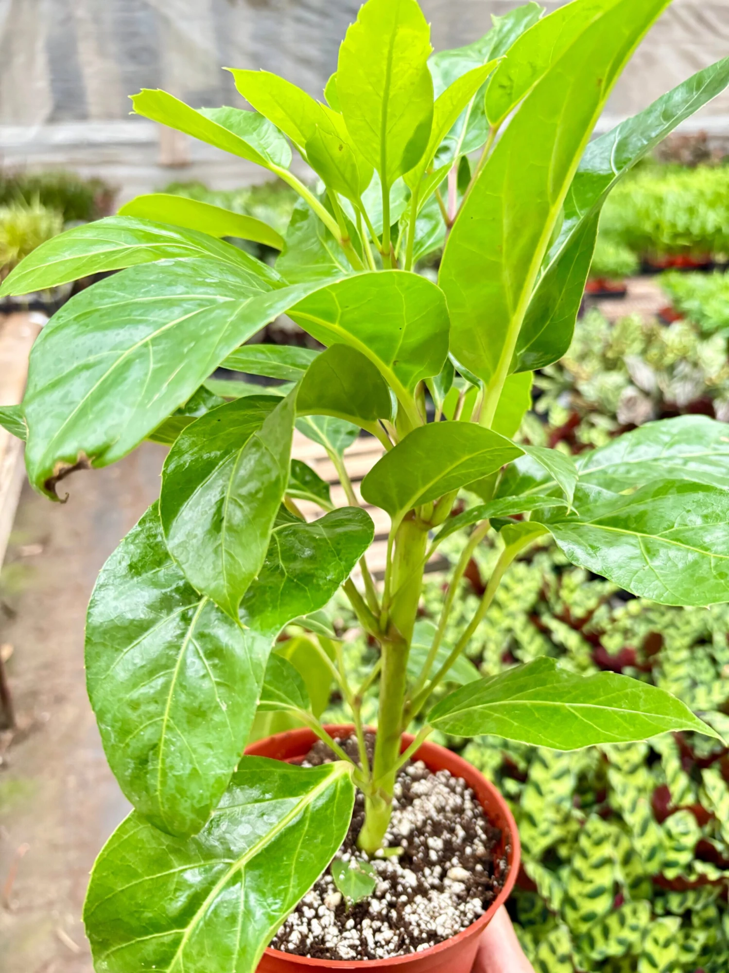 - Description: Schefflera actinophylla is known for its large, palmate leaves with numerous leaflets that radiate outward, resembling an umbrella. The plant has a single or multiple trunks and smooth, greenish bark. It features large, bright green, shiny leaves that can be up to 12 inches long.