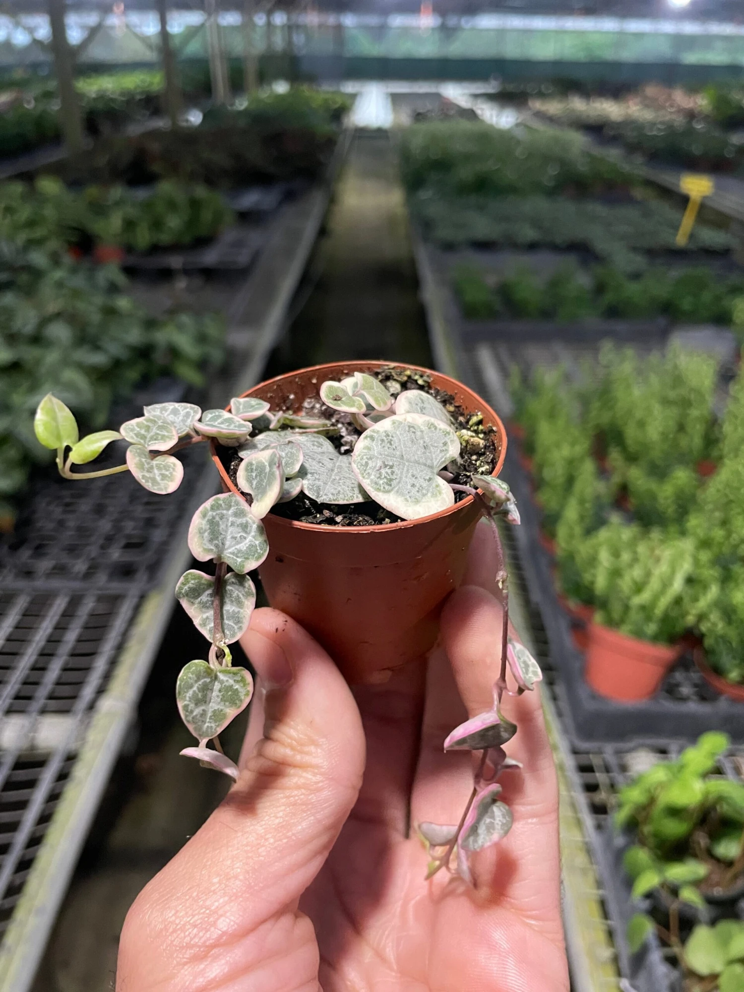 - Description: The string of hearts is a trailing succulent native to South Africa. This plant has long, loose tendrils with circular, spade shaped leaves which gives it the appearance of small hearts growing along its vines. The plants foliage has a blotched pattern which can range from pink to light green, giving it a very unique camo-like look.